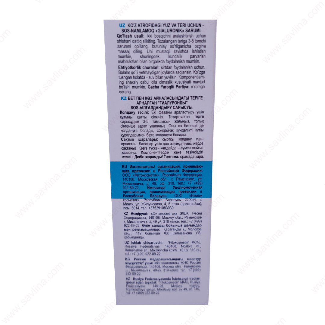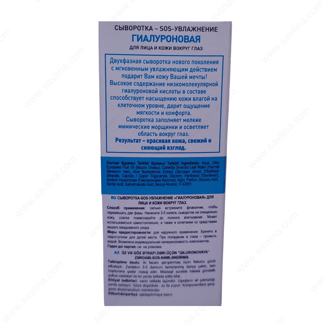 SOS-Hyaluron serumu iki fazalı innovativ məhsuldur və dərini dərhal nəmləndirərək parlaq və təravətli görünüş verir. Yüksək konsentrasiyalı aşağı molekulyar hialuron turşusu dərini hüceyrə səviyyəsində nəmləndirir, yumşaqlıq və komfort hissi yaradır. Serum incə mimik qırışları doldurur və göz ətrafındakı sahəni işıqlandırır. Nəticədə – gözəl, təravətli və parlaq dəri ilə canlı baxışlar.